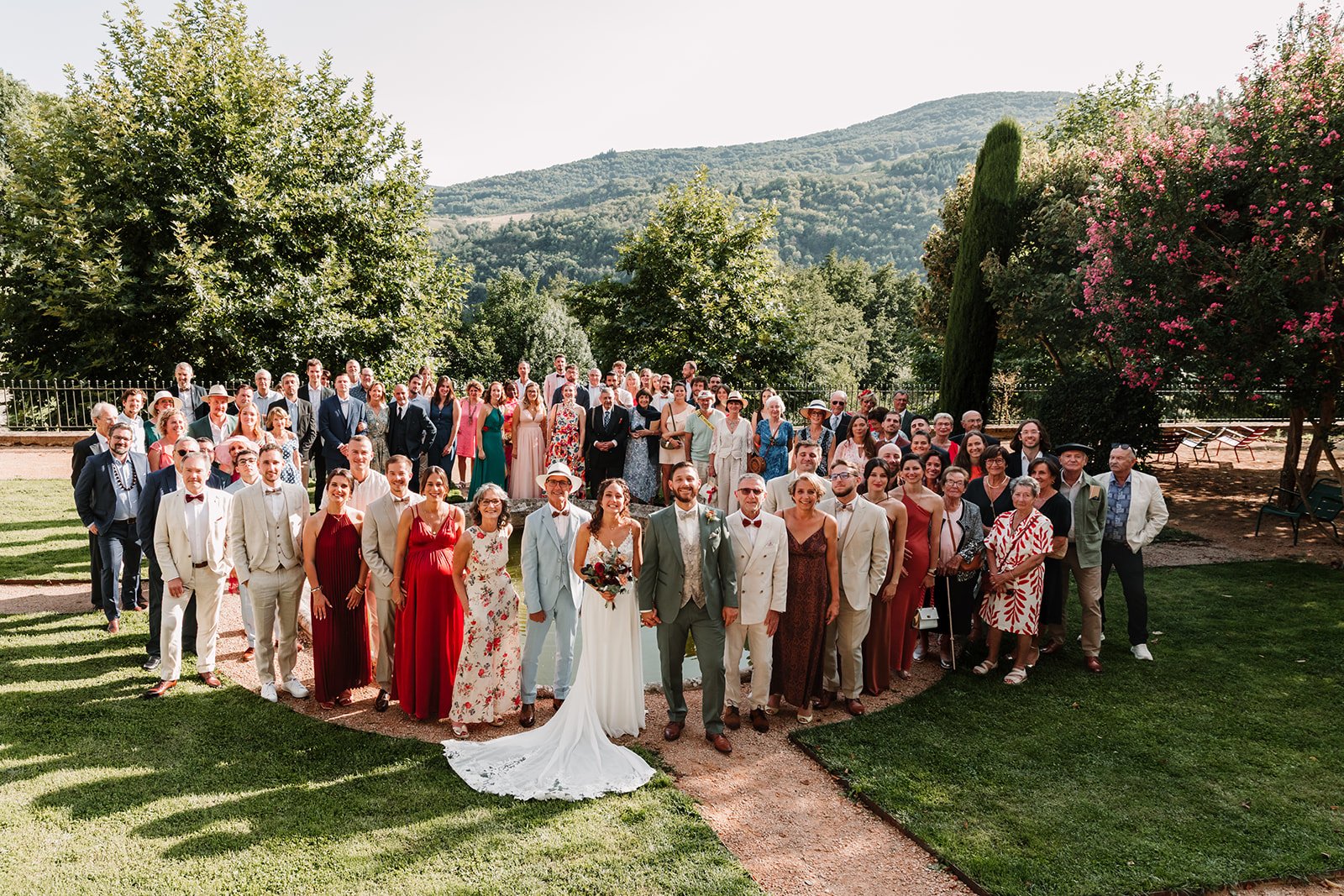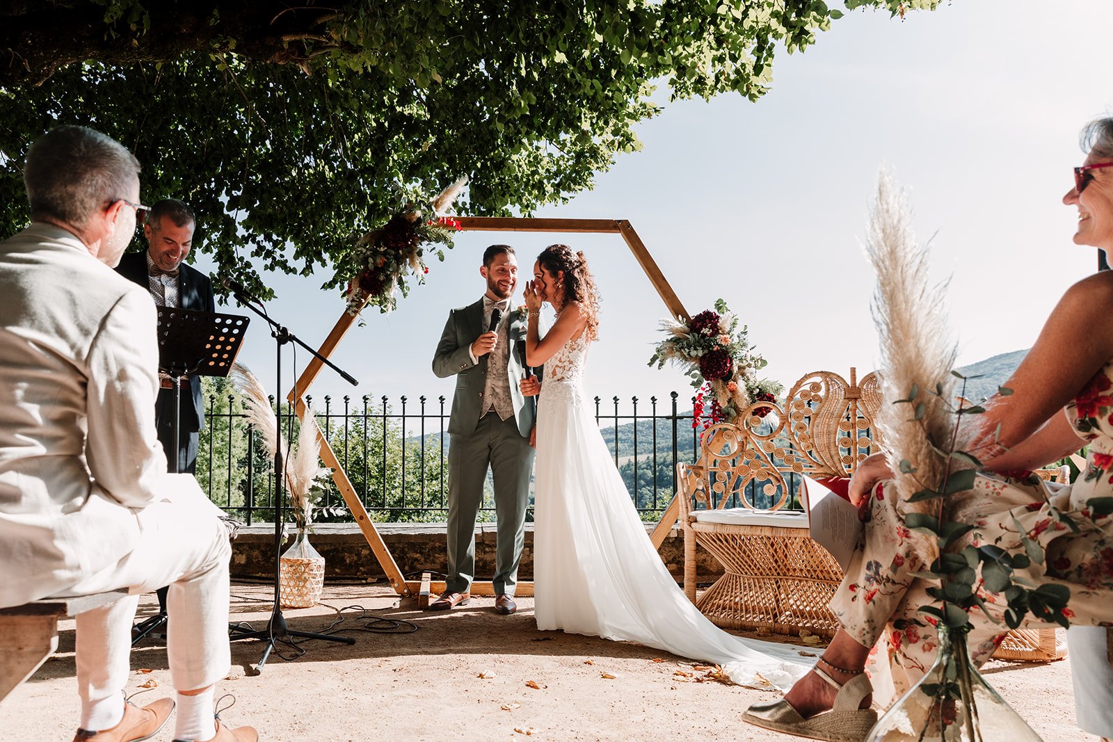 La cérémonie était religieuse, menée par un pasteur sous les grands arbres, avec une très belle vue sur le paysage tout autour.
