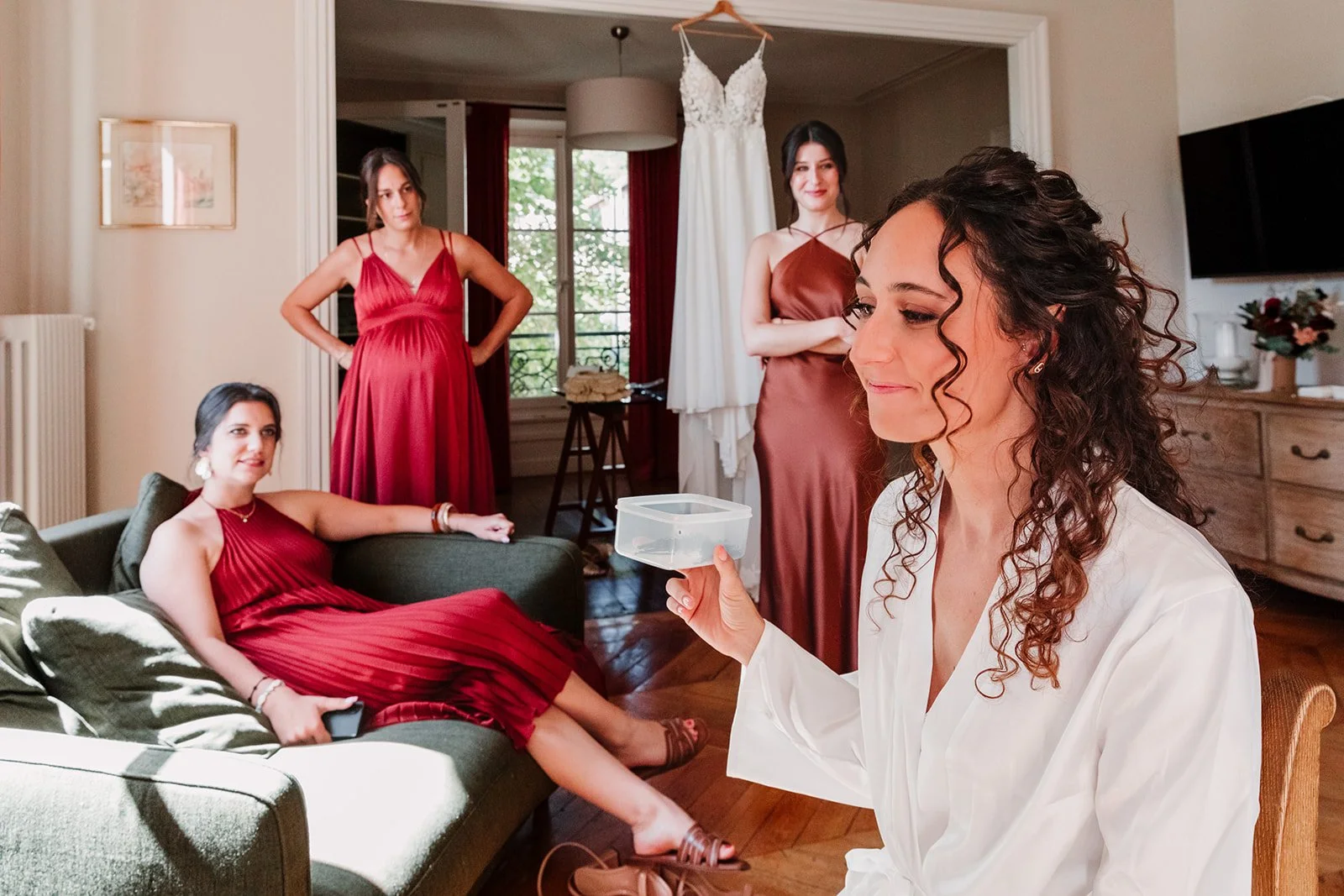 Côté filles : ambiance plus calme, plus douce, avec des petites choses à grignoter, beaucoup d’émotion (surtout au moment de l’habillage avec la maman) et une belle complicité.