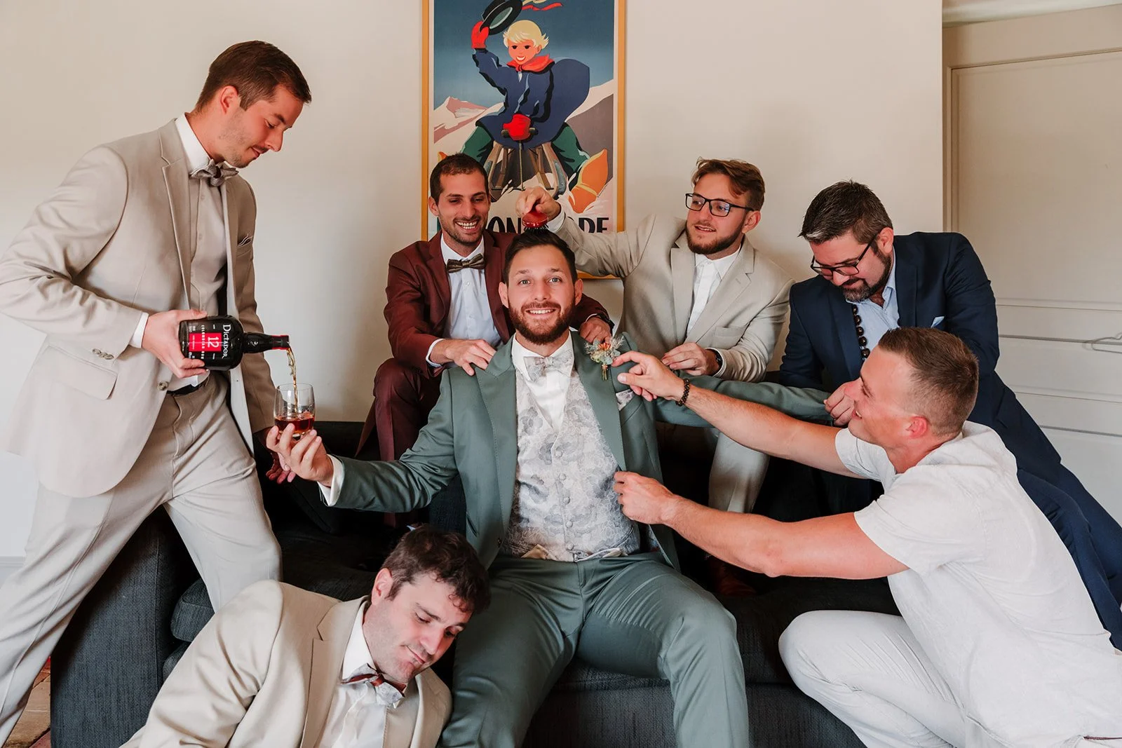 Côté garçons : dans une ambiance bon enfant, on sort les costumes, on ajuste les détails, on cire les chaussures… et on se chambre un peu, évidemment.