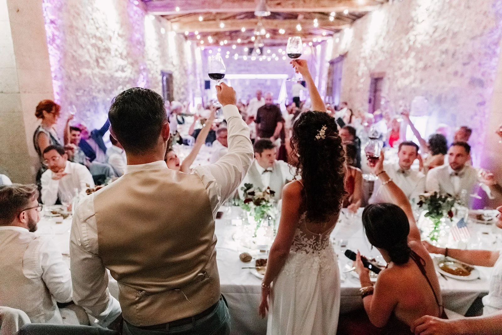 Vous avez plusieurs ambiances sans changer de lieu. Entre les jardins et terrasses (plein sud, vue sur les vignes), la grande salle, et les espaces en pierre plus intimistes, vous pouvez enchaîner la cérémonie, le cocktail, le dîner, la soirée, sans avoir l’impression de revivre la même scène dans le même décor toute la journée.