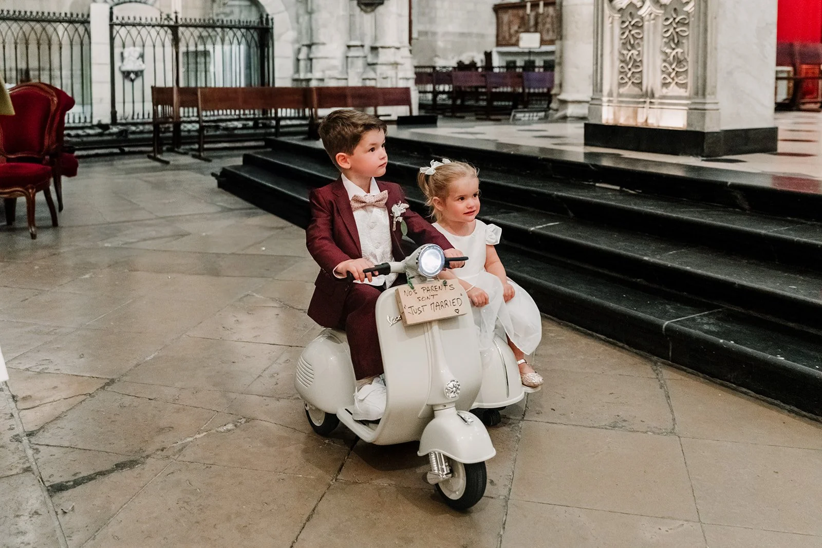 À la sortie, les témoins avaient une surprise pour les mariés : une mini-moto avec side-car pour les deux enfants du couple !