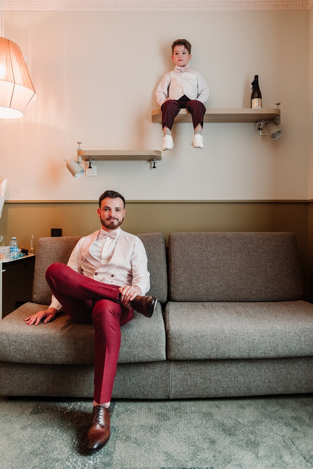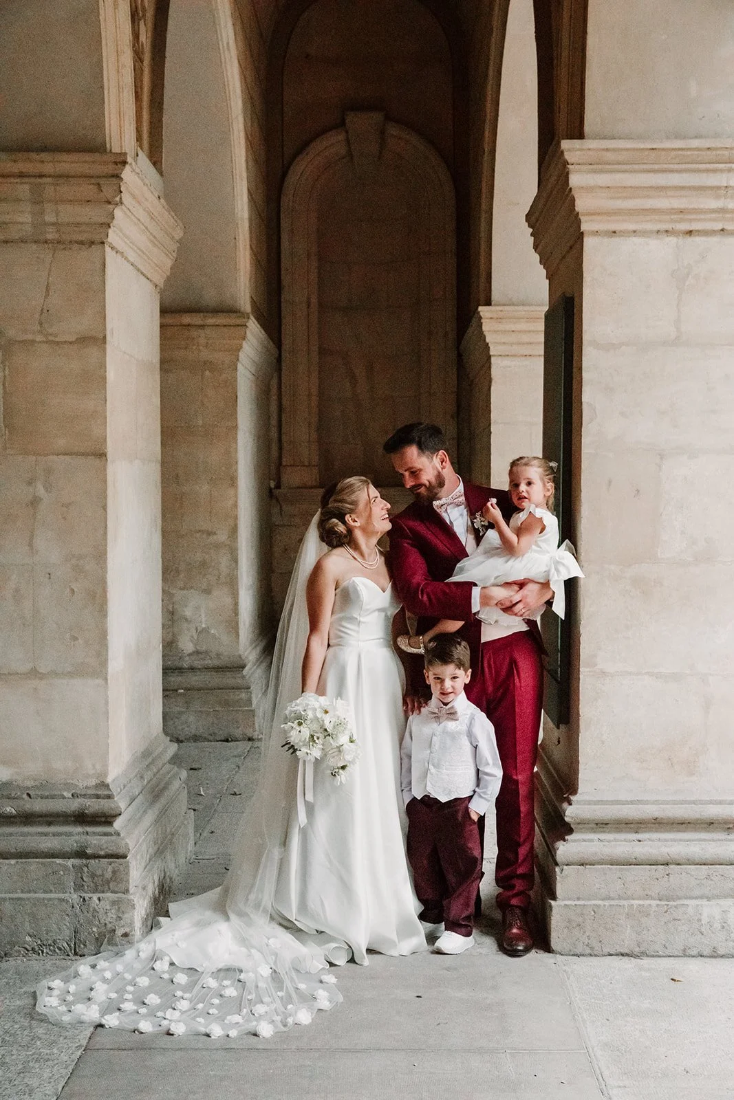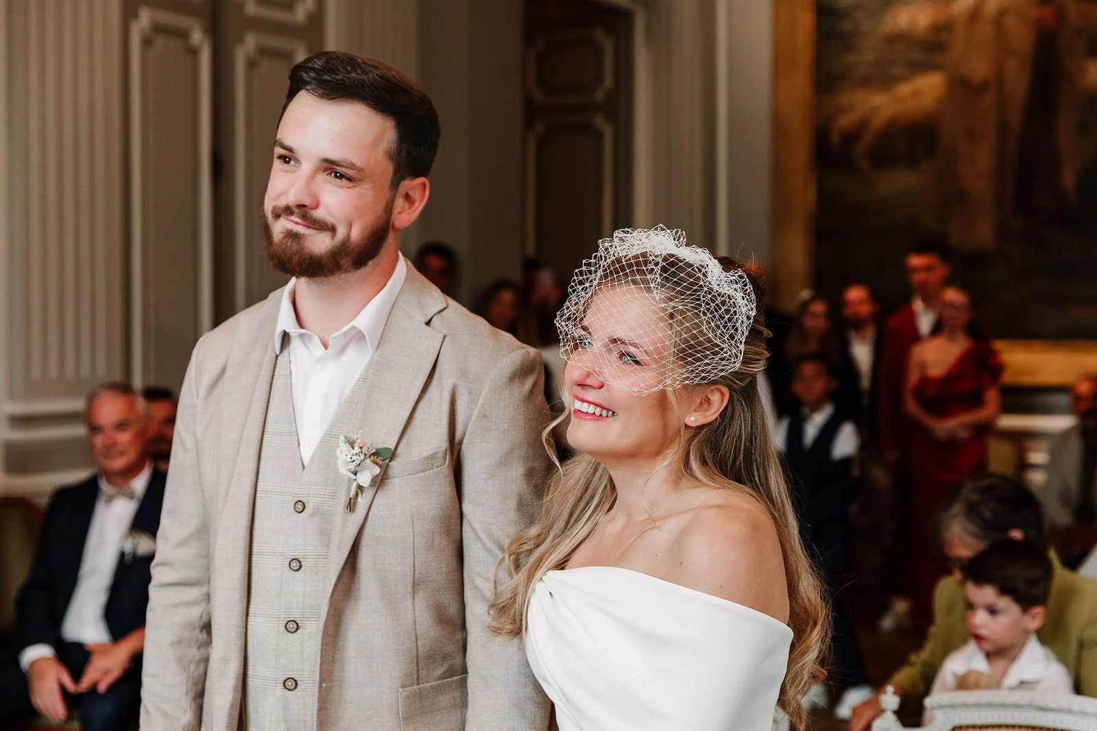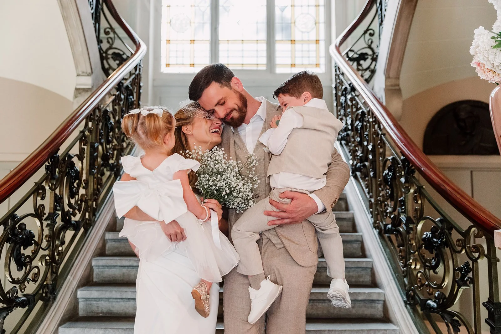 Le marié était avec ses témoins, la mariée avec ses enfants, chacun à un étage différent, et c’était assez drôle de les voir s’envoyer les enfants comme des petits messagers selon ce qu’il fallait récupérer ou transmettre !
