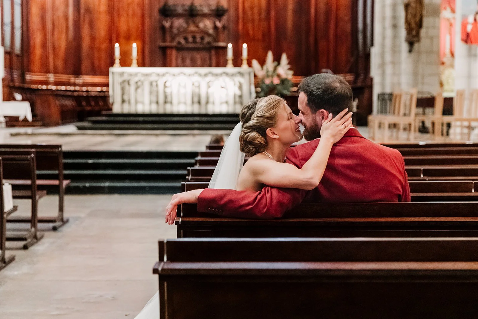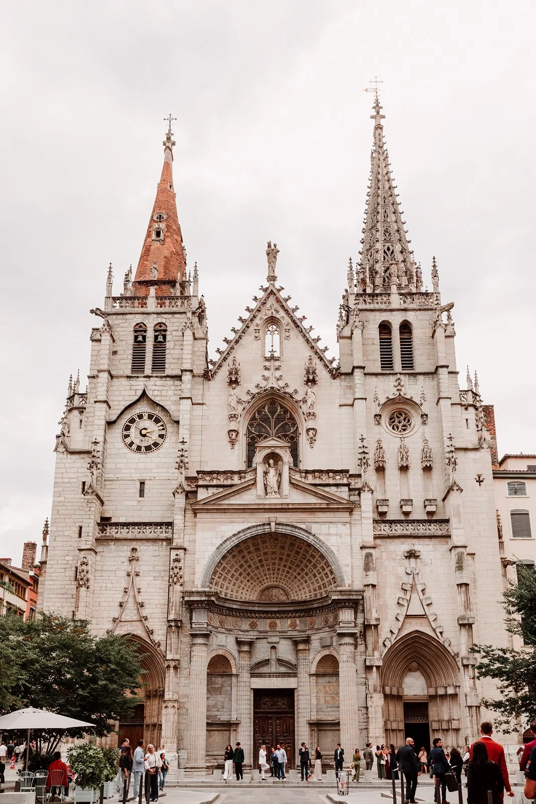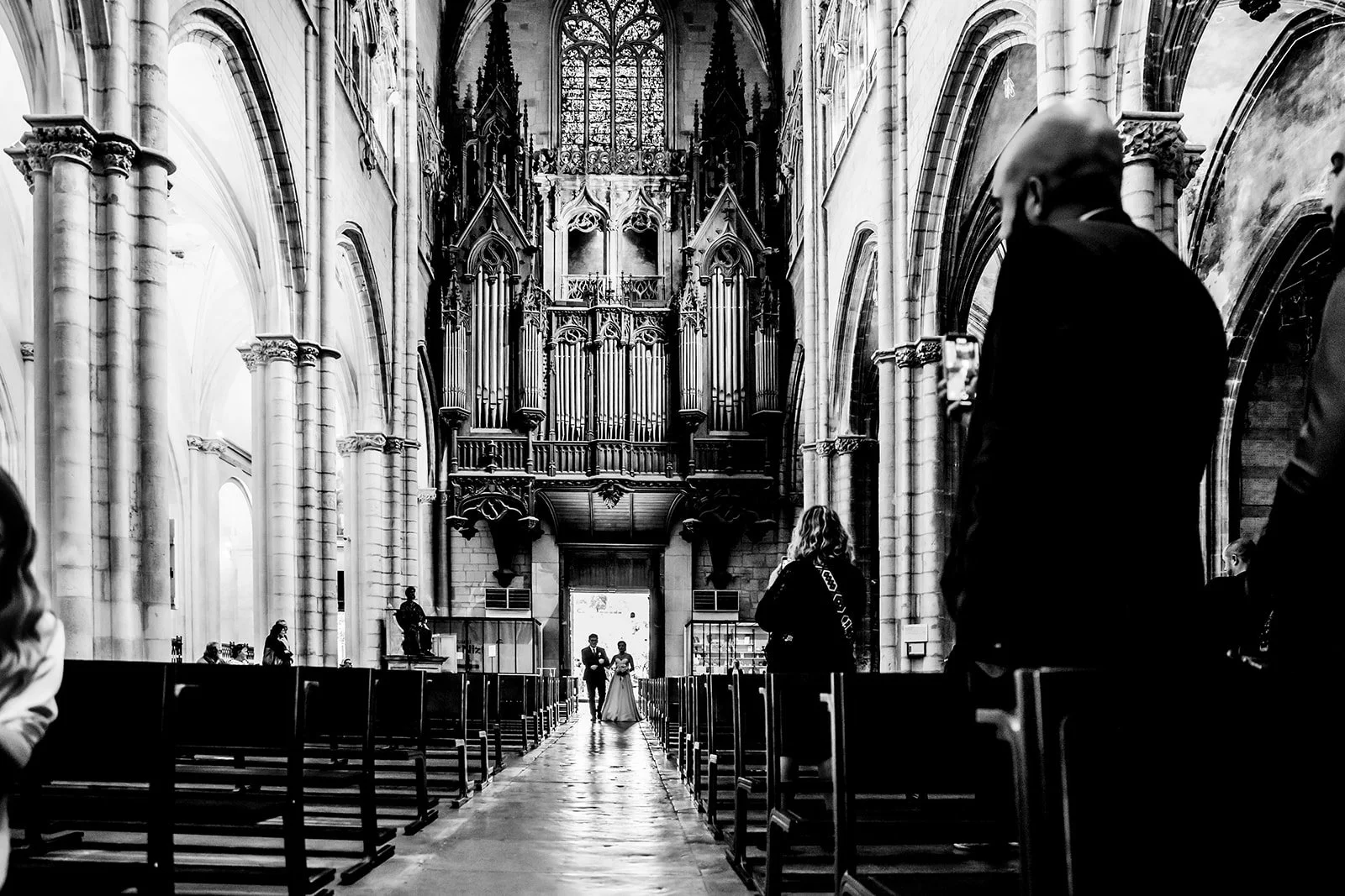 Puis tout le monde est reparti, toujours en métro, pour rejoindre l’église Saint-Nizier. Pour ce mariage-là, c’était encore un choix très cohérent : une église en plein centre de Lyon, qui permettait de rester dans cette logique de journée urbaine, avec plusieurs points d’intérêt très proches pour continuer à pied.