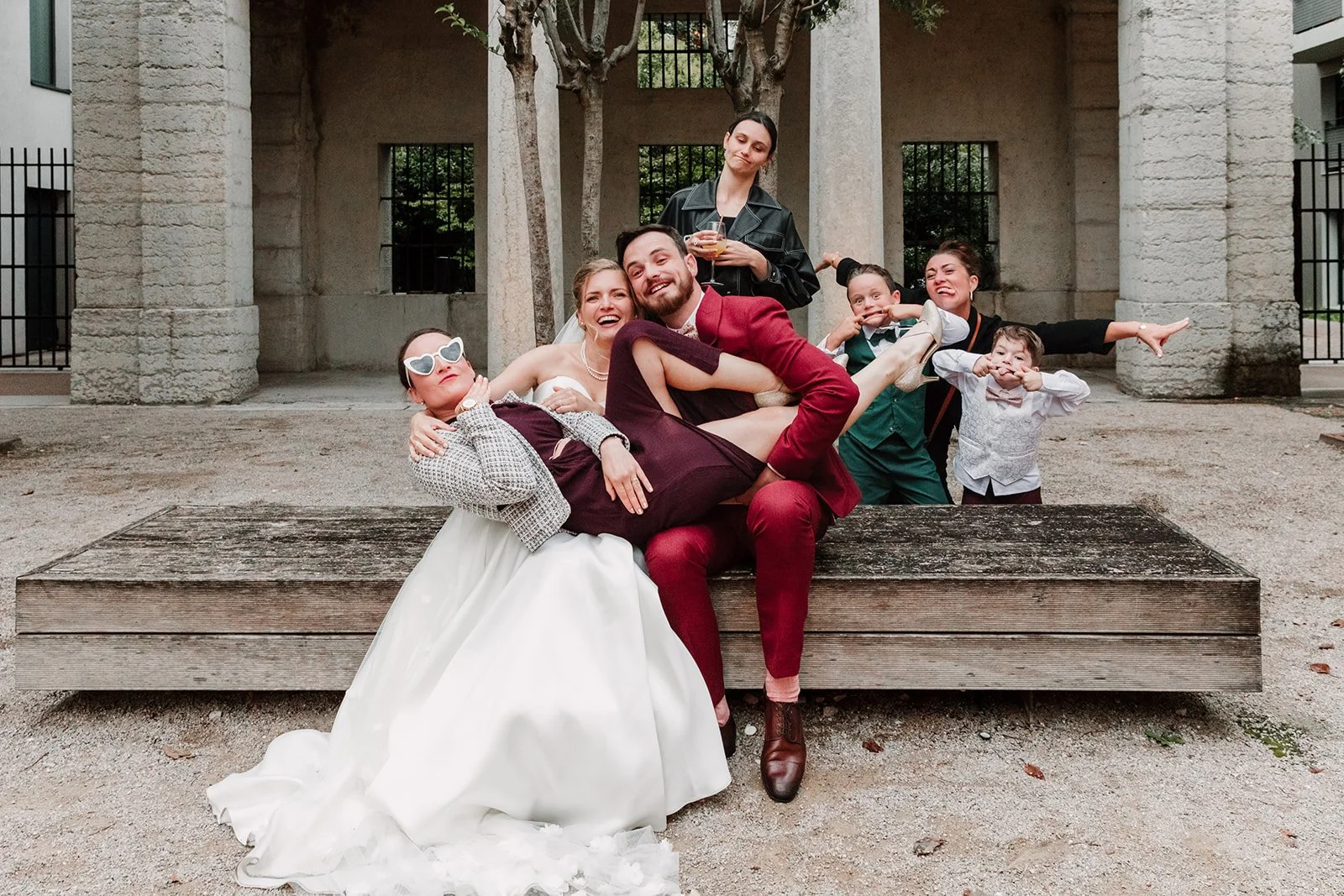 Pendant le cocktail, il y a aussi eu un photo rush : le temps d’une chanson, les mariés s’installent, tout le monde attend en file et les groupes s’enchaînent pour poser avec le couple avant de laisser la place au groupe suivant. Ça va vite, ça garde de l’énergie, et ça permet d’avoir plein de photos en un temps record !